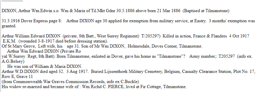 In the Dover Express, dated 14 October 1921, is a page dedicated to the Tilmanstone War Memorial being unveiled. The notation on his family’s wreath is “In loving memory of Arthur Dixon, from Father, Mother and Sisters”.